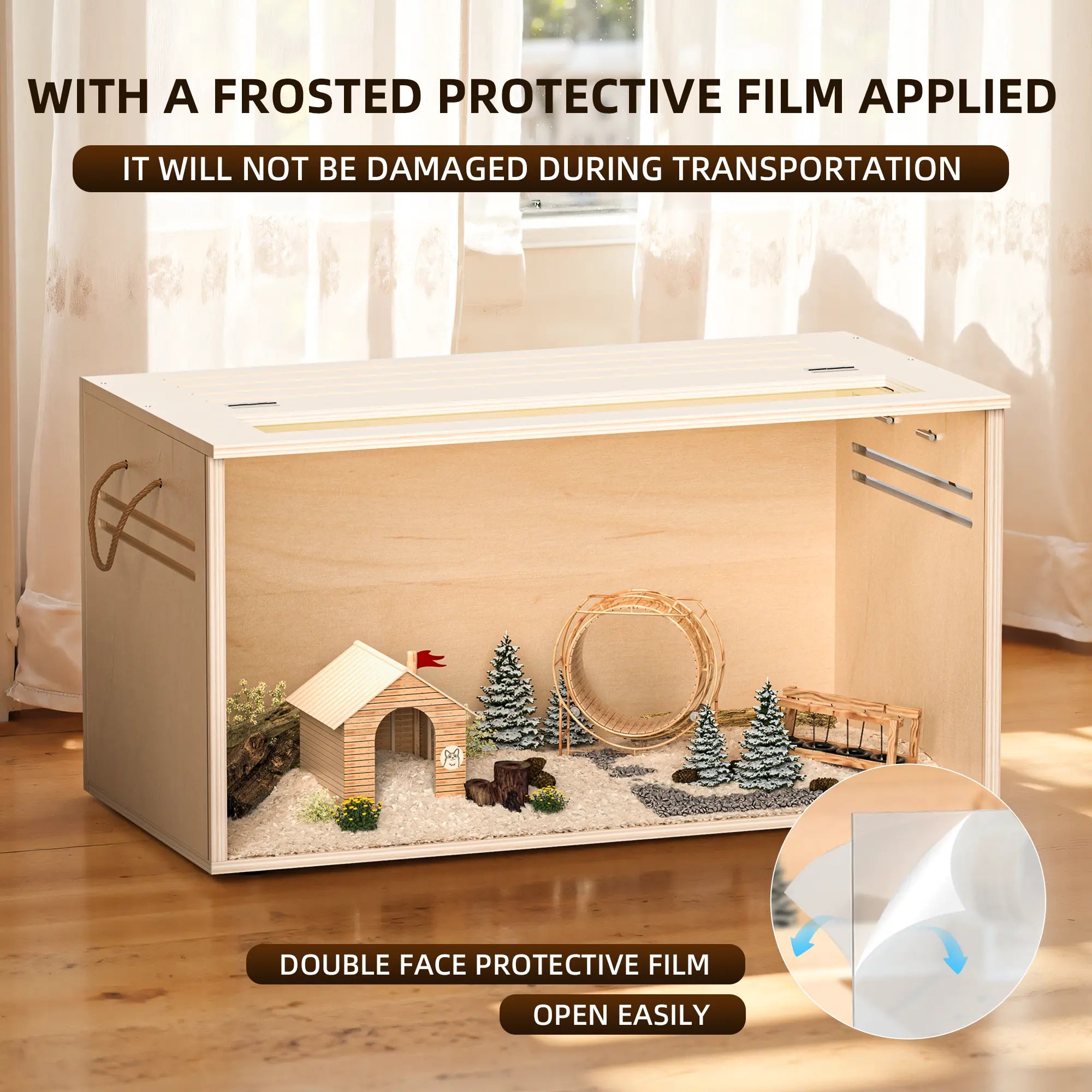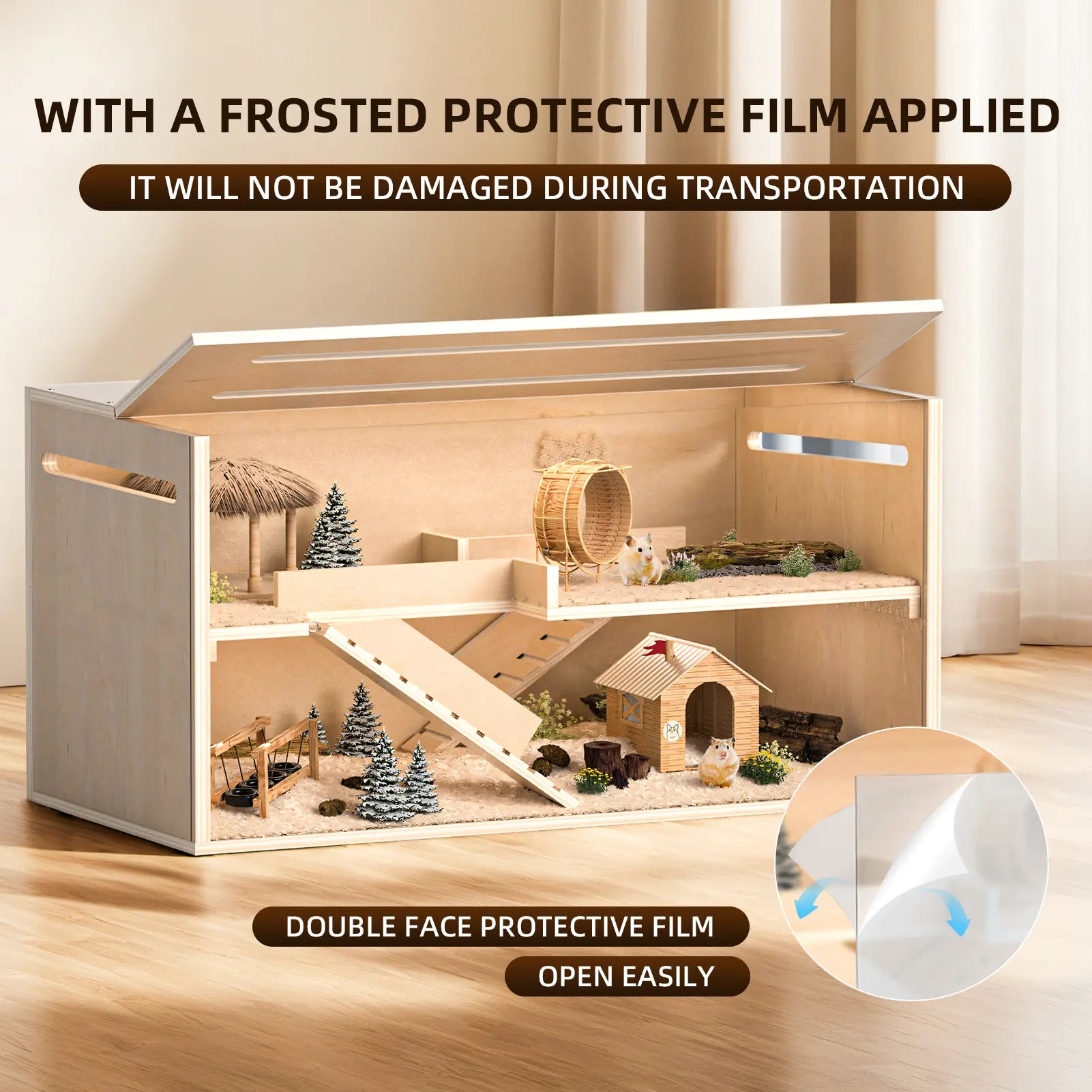 •【Chewproof and Ventilation Design】Unlike other guinea pig cages, our natural poplar wood hamster cages have polyester coating on both sides, which is not only waterproof and anti-corrosion, but also makes hamsters have no interest in chewing our cages. There are two vents and a transparent observation window on the top of the cage. The vents ensure air circulation and remove odors in the cage. The observation window is easy to open and provides more angles to observe the whereabouts of the small animals.